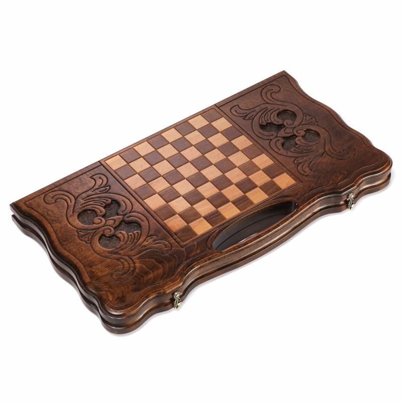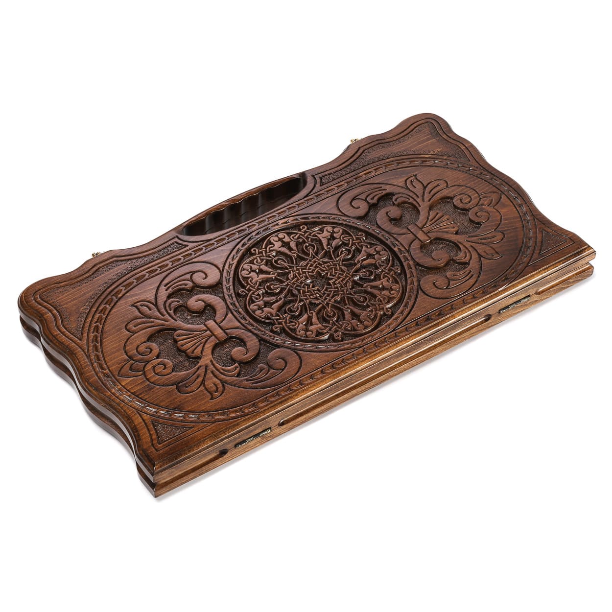 Резные нарды ручной работы выполнены лучшими армянскими мастерами. Доска изготовлена из натурального дерева бук. Петли и замки - бронза. Упакованы в сумку-чехол. Такие нарды будут радовать своего владельца долгие годы, а играть в них одно удовольствие. Если Вы решили купить хороший подарок себе или знакомому, то эти нарды в самый раз.