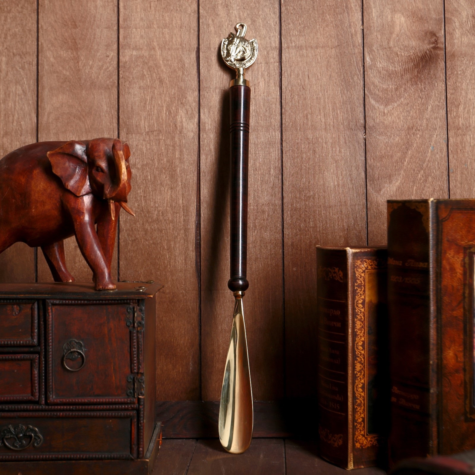 Ложка для обуви с художественным оформлением — это практичный аксессуар с детализированной ручкой в форме лошади внутри подковы. Изготовлена из латуни с деревянными вставками, имеет длину 52 см. Золотисто-коричневое покрытие создает эффект антикварного изделия. Узкая ложка шириной 2.5 см легко проникает в труднодоступные участки обуви.