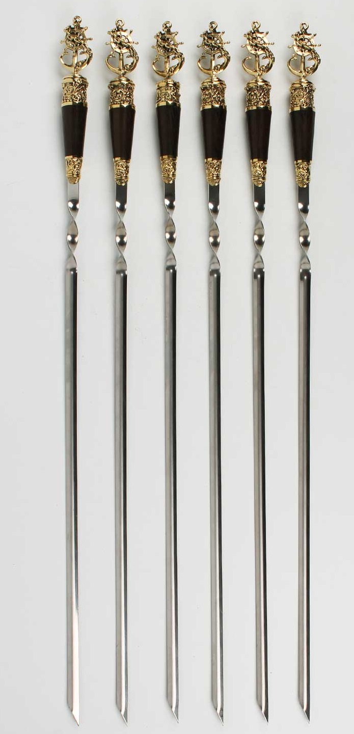 Наши наборы шампуров — это элитный подарок мужчине на любой праздник, юбилей или день рождения. Это оригинальный, практичный и главное долговечный презент. Такие шампура не только красивы, но и очень удобны в использовании. Набор из 6-ти шампуров всегда пригодится на природе, чтобы приготовить вкусные и полезные блюда — мясо, рыбу, овощи. Рабочая длина 55 см